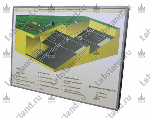Описание. Стенд представляет собой жёсткую лицевую панель из МДФ толщиной не менее 9 мм в пластиковом каркасе толщиной, менее 100 мм, но более 85 мм. На лицевую панель наклеена полимерная подложка с цветным изображением технологической схемы угольного разреза. Внутри каркаса расположен контроллер управления логикой стенда. С целью наглядной иллюстрации принципа работы схемы в лицевой панели установлены динамическая светодиодная подсветка и магнитные сенсоры для реализации режимов «обучения» и «контроля». В режиме «обучения» при выделении одного из элементов технологической схемы загорается светодиод напротив соответствующего наименования элемента. В режиме «контроля» учащийся должен сам сопоставить наименование элемента с его изображением на технологической схеме. В комплект поставки входят: магнитная указка, блок питания с рабочим напряжением 220 В.