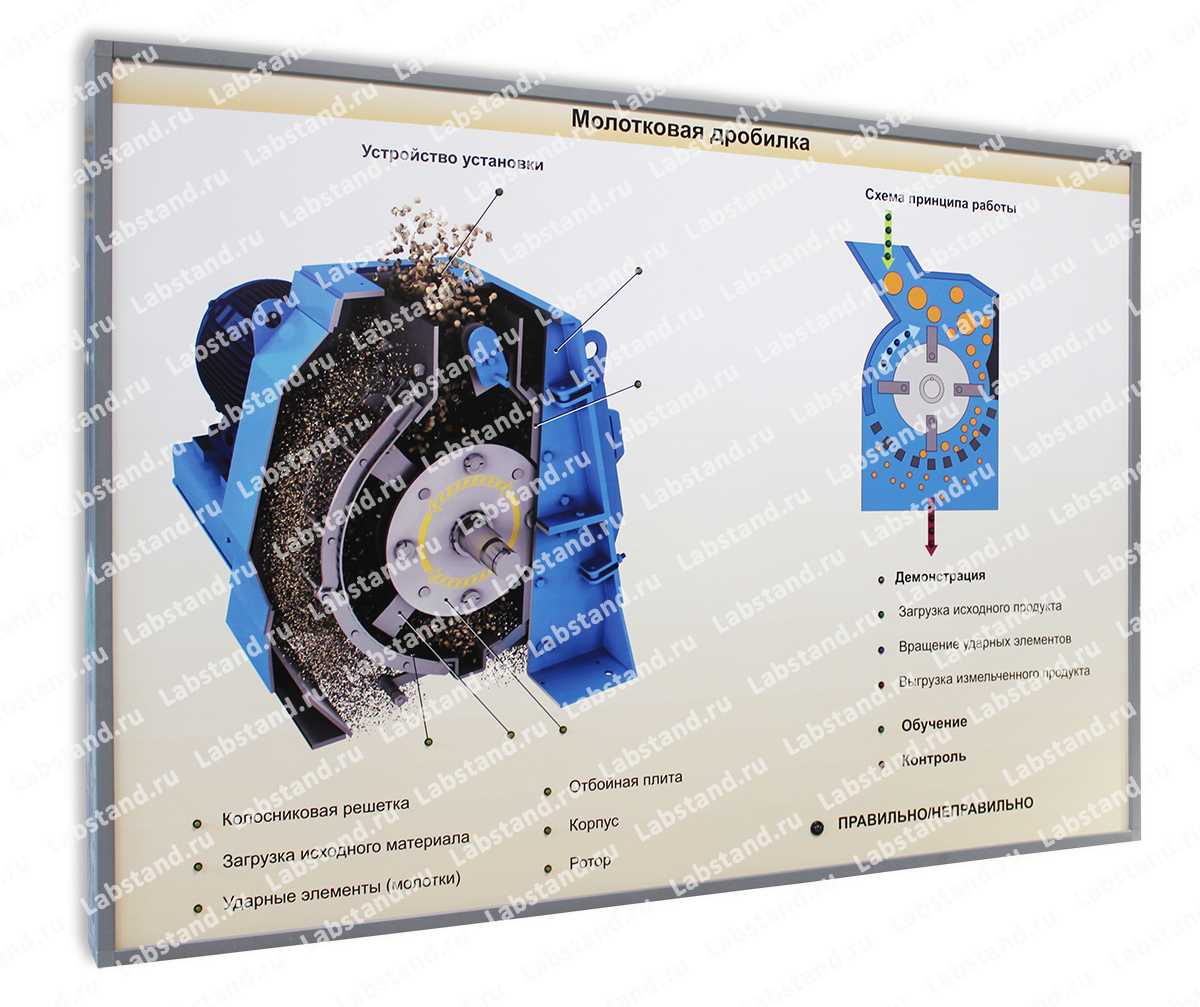 Состав: Стенд-планшет «Молотковая дробилка», магнитная указка, блок питания, паспорт.