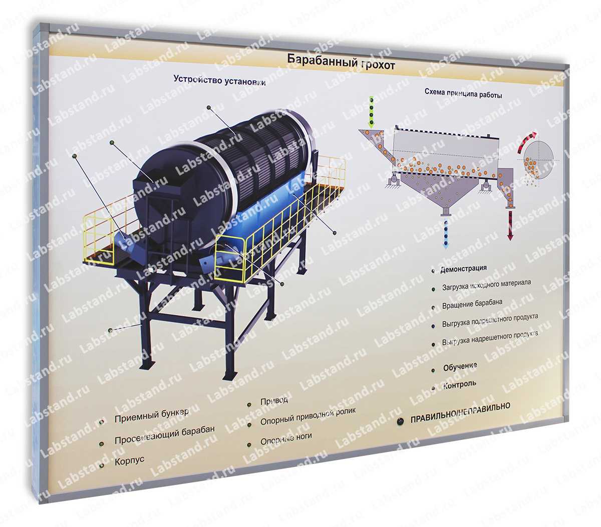 Описание: Стенд представляет собой жёсткую лицевую панель из МДФ толщиной 8 мм, в пластиковом каркасе толщиной 90 мм. На лицевую панель наклеена полимерная подложка с цветным изображением барабанного грохота, отражающим его принцип работы и устройство. Внутри каркаса расположен контроллер управления логикой стенда. С целью наглядной иллюстрации принципа работы и устройства установки на лицевой панели установлены динамическая светодиодная подсветка и магнитные сенсоры для реализации режимов «демонстрация», «обучение» и «контроль». В режиме «демонстрация» осуществляется светодинамическая демонстрация принципа работы установки. В режиме «обучение» при выделении одного из элементов установки загорается светодиод напротив соответствующего наименования элемента. В режиме «контроль» учащийся должен сам сопоставить наименование элемента с его изображением на лицевой панели.
