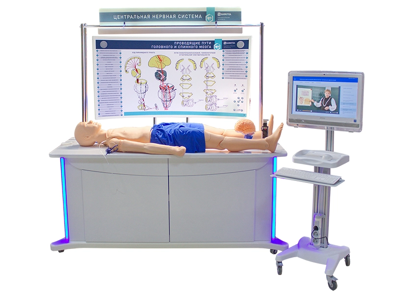 Представляет собой универсальный комплекс учебных тренажеров и методических пособий, позволяющих изучить теоретический материал, отработать практические навыки, производить контроль полученных знаний в области неврологии. Учебно-методический комплекс включает в себя тренажеры для отработки практических навыков в области неврологии, моноблок, размещенный на стойке, многофункциональный комплекс с системой хранения комплектующих, светодинамический интерактивный стенд, разборную модель головного мозга, сегмент спинного мозга.