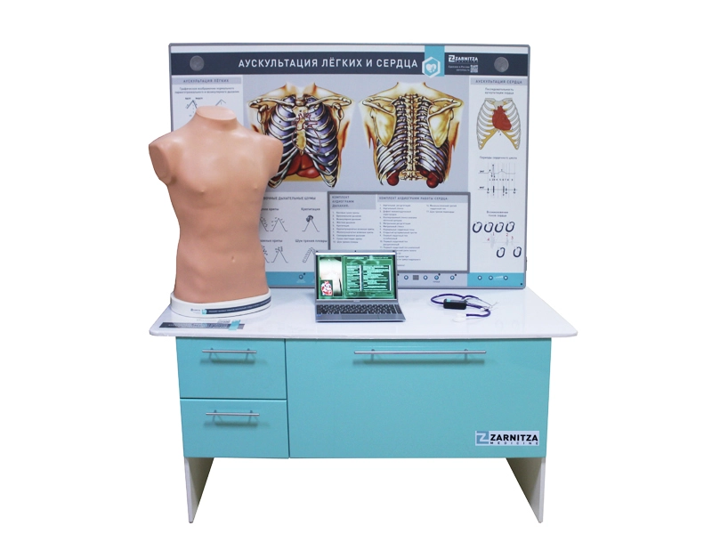 Тренажер аускультации представляет собой модель торса человека, предназначенную для отработки базовых практических навыков физикального осмотра (аускультация и пальпация). В комплектацию тренажера входит ноутбук . В стандартных точках выслушивания, которые поочередно подсвечиваются диодами с помощью программы, расположены сенсоры, при прикладывании к которым головки стетоскопа программное обеспечение генерирует заданную аудиограмму, характерную для той или иной патологии. В ПО тренажера предусмотрен режим контроля: по прослушанной аудиограмме испытуемый должен поставить диагноз, который соответствует аускультативной картине.