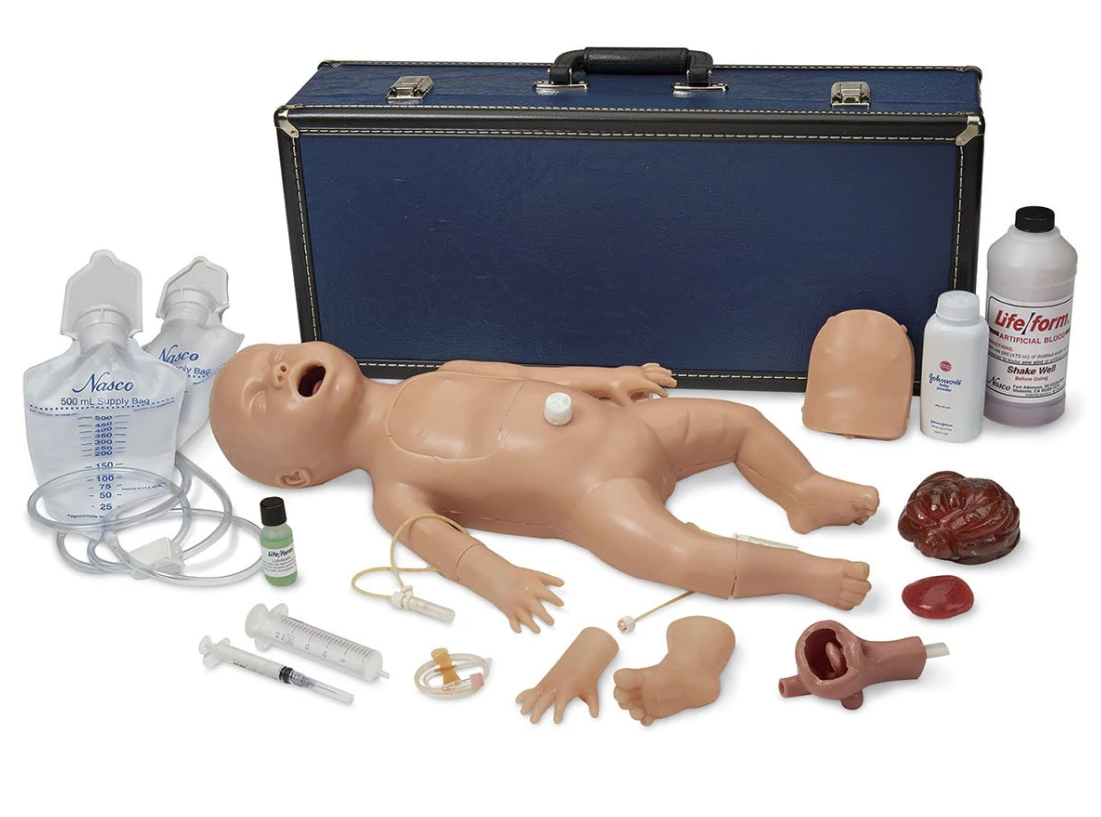- Тренажер представлен в виде полноростовой модели младенца с анатомическими ориентирами для отработки навыков ухода за новорожденным и расширенной реанимационной помощи