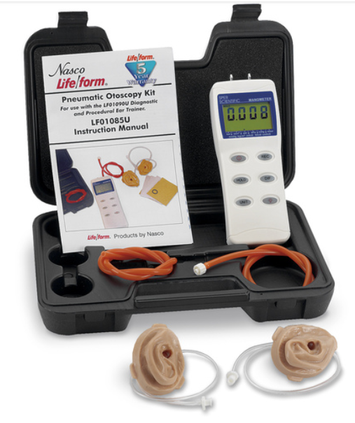 Пневматическая отоскопия является незаменимой диагностической манипуляцией в проведении обследования ушей, но, согласно исследованиям, очень часто ее выполняют неправильно! Обратная связь, осуществляемая данным комплектом, дает возможность студентам, ординаторам и практикующим врачам научиться создавать соответствующий уровень давления воздуха, необходимый для правильного выполнения пневматической отоскопии с целью определения подвижности барабанной перепонки. В комплект входит пневматический манометр, две модели ушей для пневматической отоскопии и упаковка из 100 барабанных перепонок.