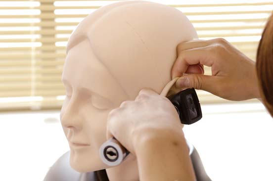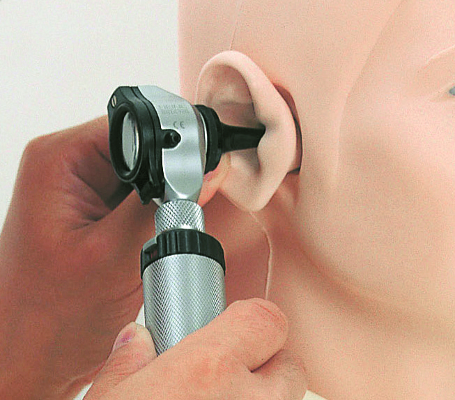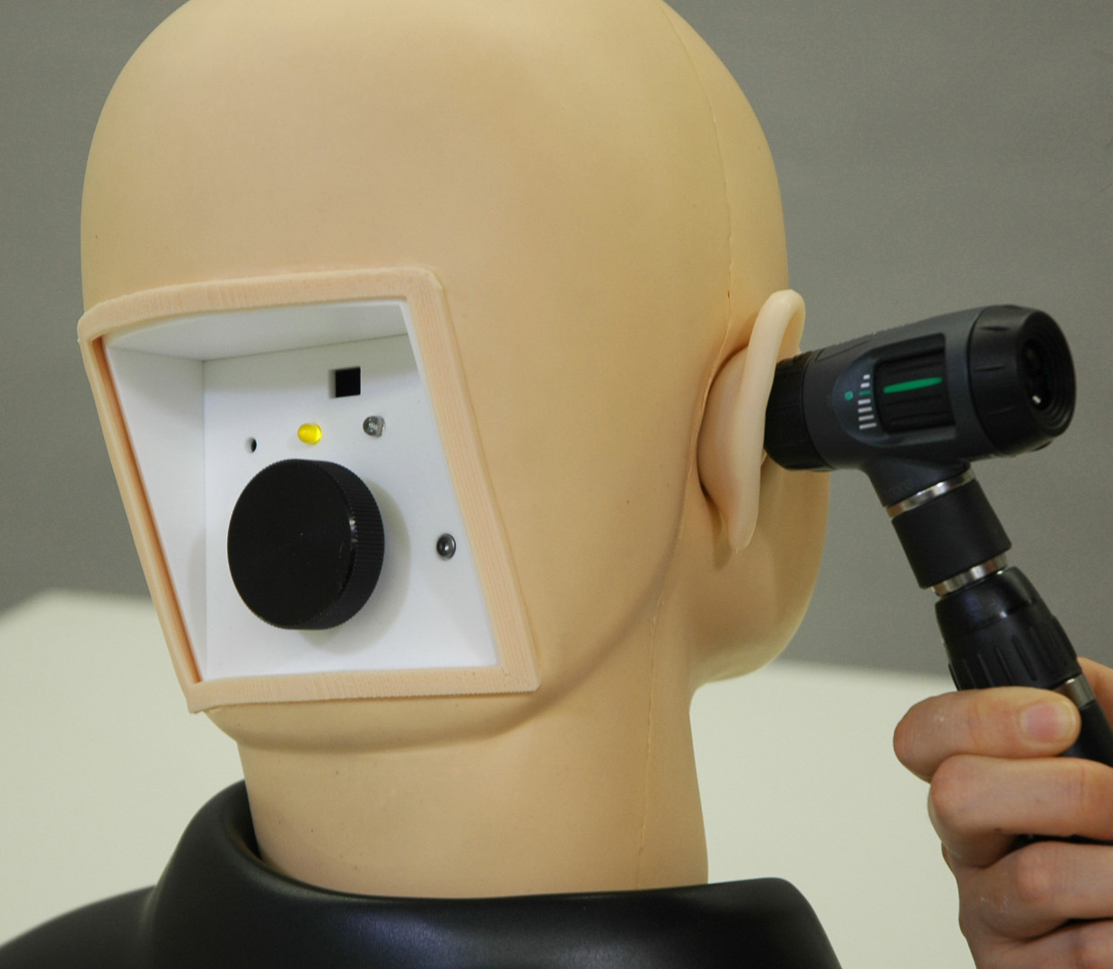 - тренажер предупреждает о слишком глубоком введении отоскопа в ухо при помощи звукового сигнала (вариант самостоятельного обучения) или красного и зеленого световых сигналов без звука (вариант обучения с инструктором)