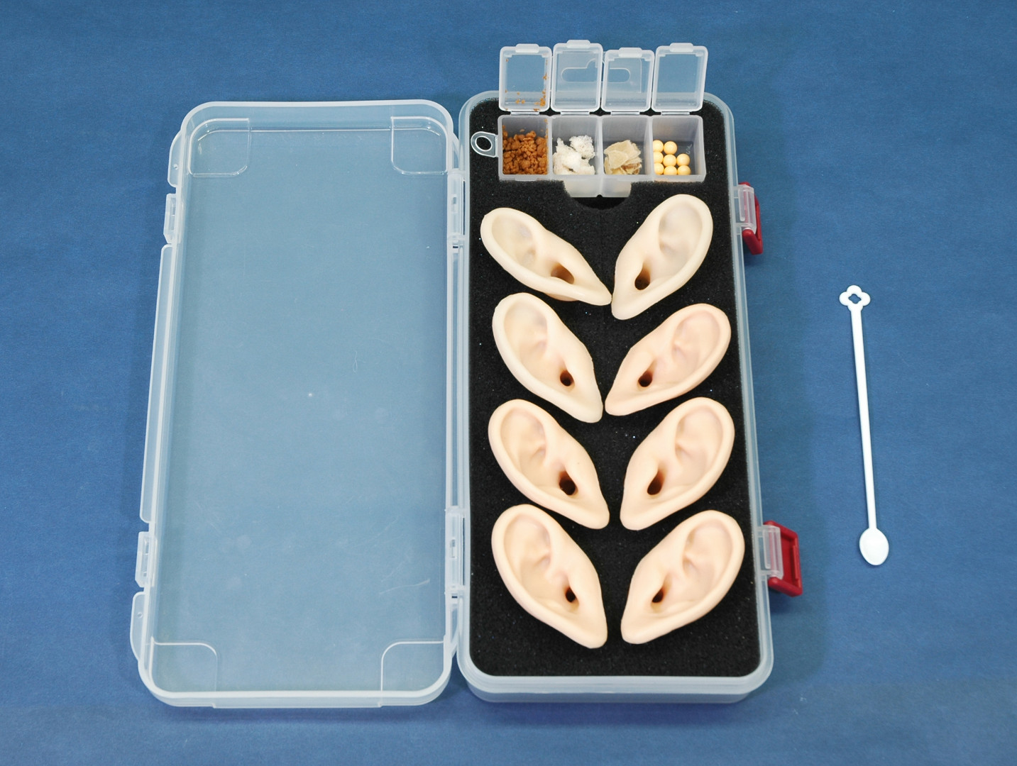 - тренажер укомплектован набором для обучения технике удаления инородных тел уха: имитированная ушная сера, мелкие предметы, мелкие кусочки губки, ложечка