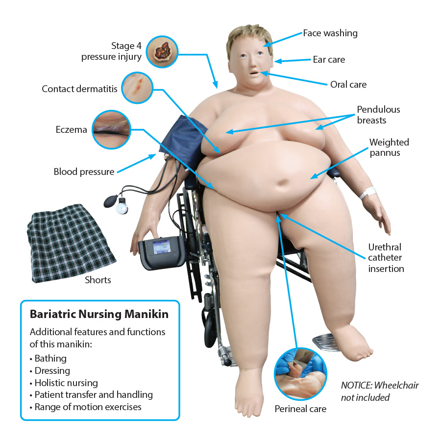 Создавайте более реалистичные сценарии практики ухода за пациентами с помощью этого единственного в своем роде манекена, который представляет собой мужчину весом 158 кг. Используйте эту реалистичную форму, чтобы помочь учащимся подготовиться к уникальным задачам, связанным с бариатрическими пациентами или пациентами с ожирением, такими как:
