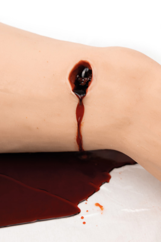Тренажер для обучения действиям при травмах нижних конечностей служит для тренировки мер первой помощи и практики навыков остановки сильных кровотечений. Тренажер представляет собой травмированную нижнюю конечность с рваной раной, а также с входным и выходным пулевыми отверстиями. С его помощью можно практиковать способы прямого давления, бинтования ран, наложения давящих повязок и жгутов для фактической остановки кровотечения (жгут в комплект не входит).