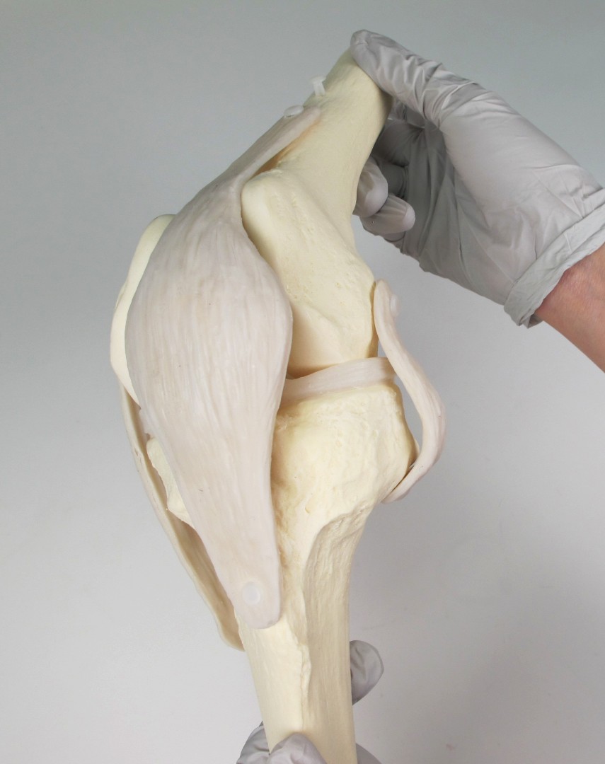 - регулируя длину сухожилия четырехглавой мышцы бедра, можно демонстрировать разгибание и сгибание колена и наблюдать движения связок и надколенника