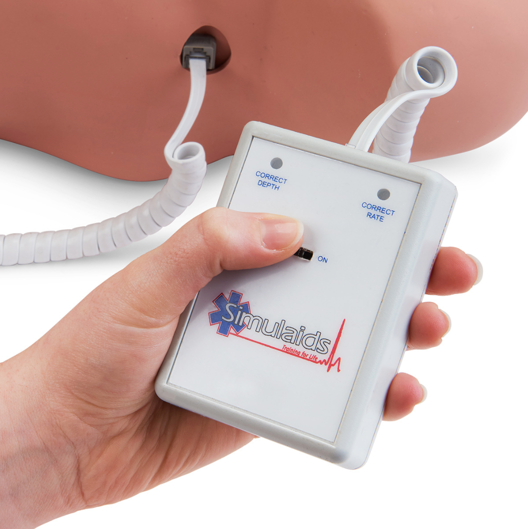 - тренажер укомплектован проводным контроллером со световыми индикаторами правильности частоты и глубины компрессий